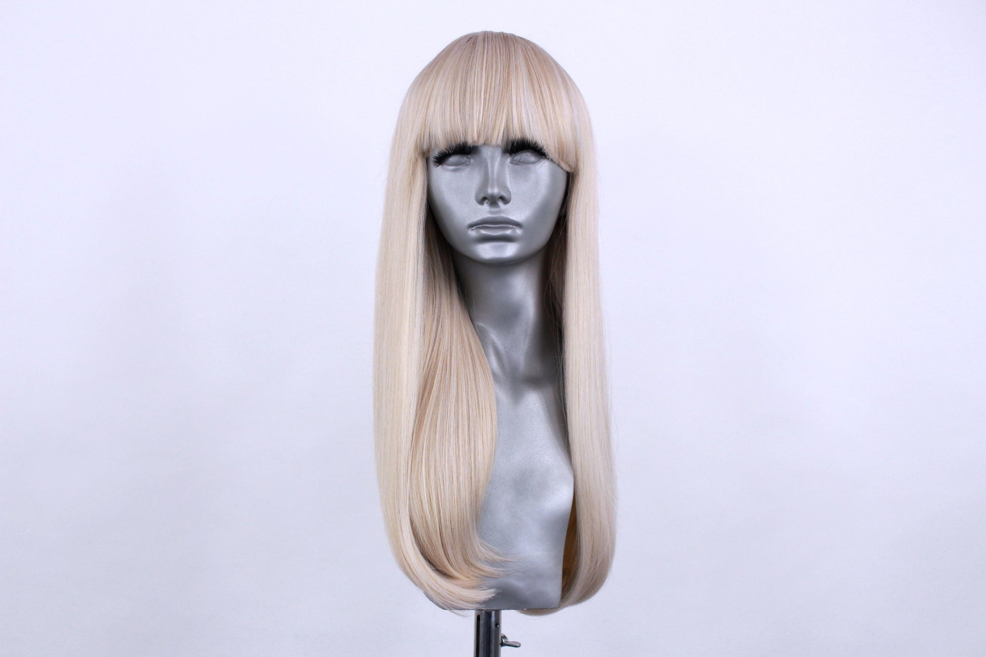 She is a non lacefront wig with a blunt cut fringe and a skin top parting at the crown for a more realistic looking part.