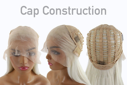 She also has a 4.5 inch deep parting space, giving you a free choice of parting anywhere across the front of the wig, on a soft light coloured invisible Swiss lace front.