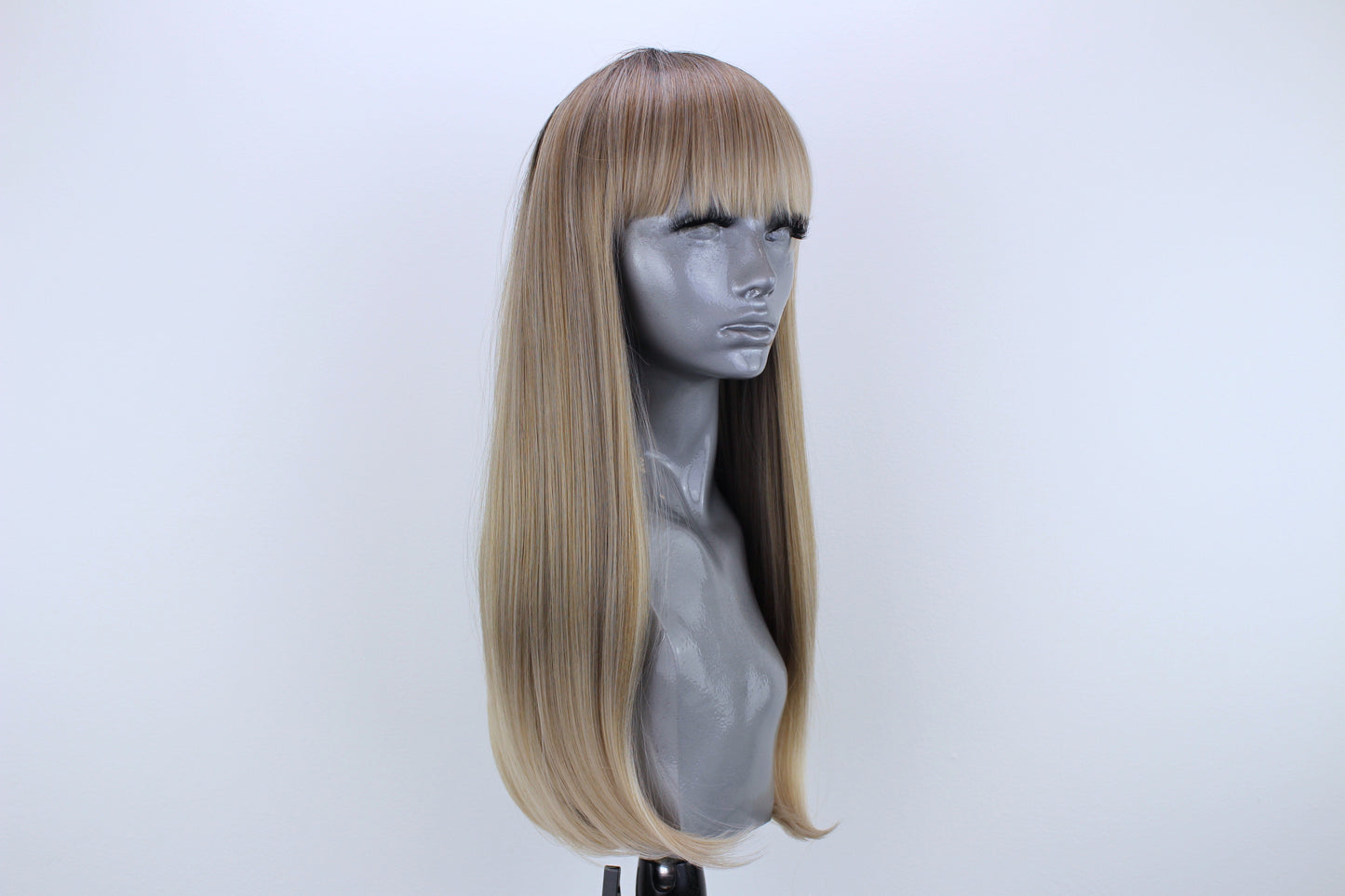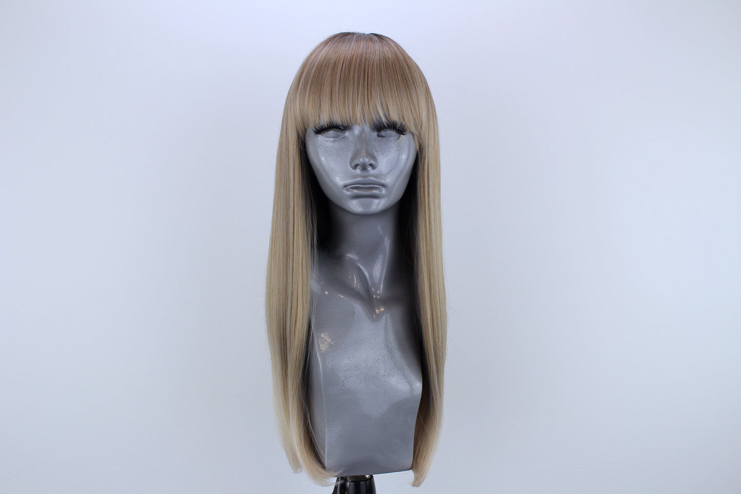 She is a non lacefront wig with a blunt cut fringe and a skin top parting at the crown for a more realistic looking part.