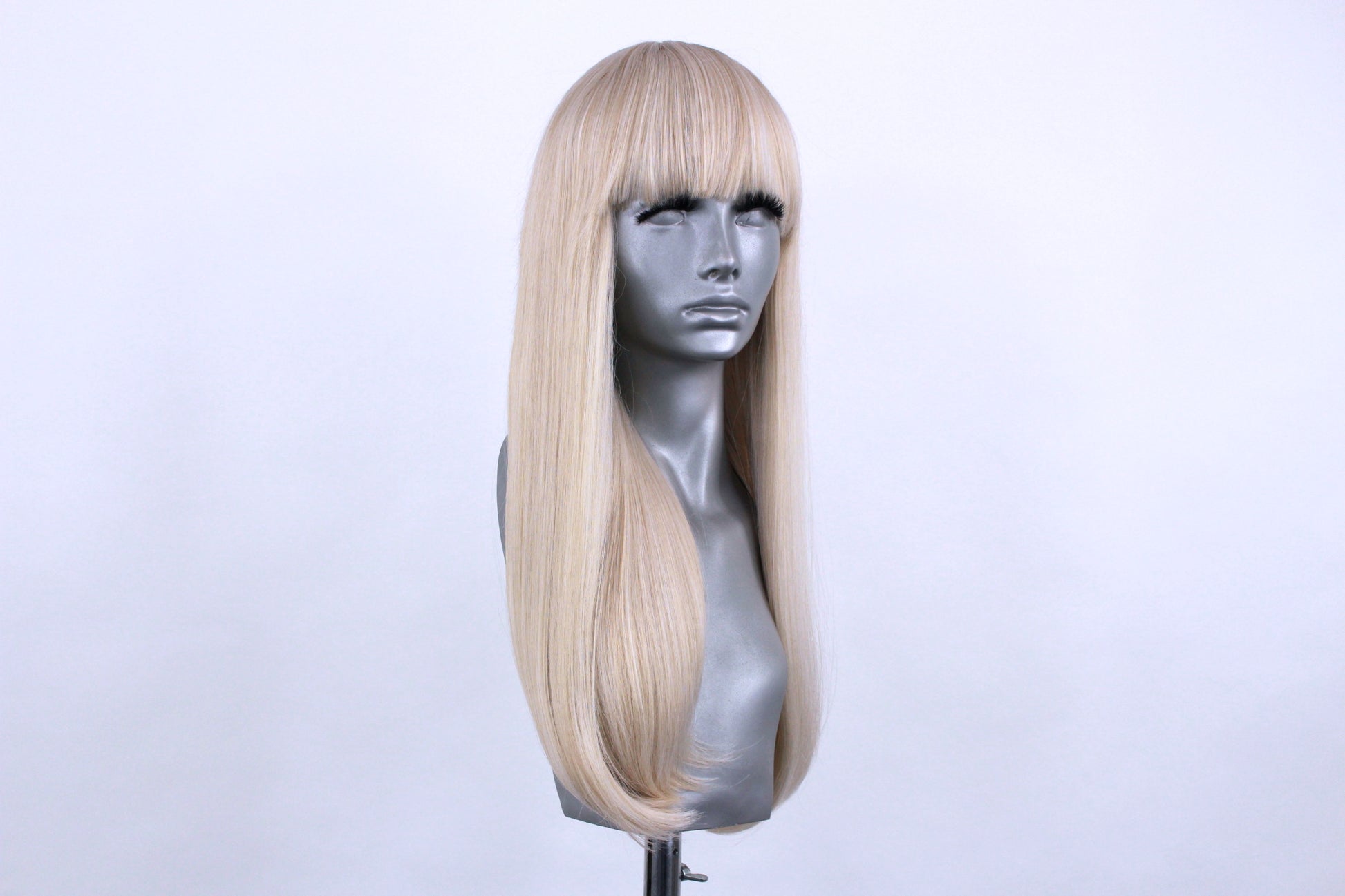 She is a non lacefront wig with a blunt cut fringe and a skin top parting at the crown for a more realistic looking part.