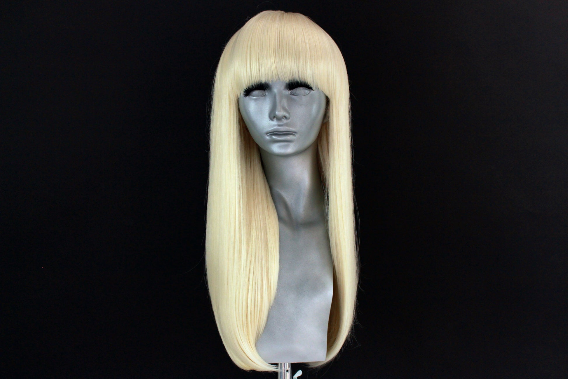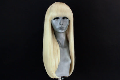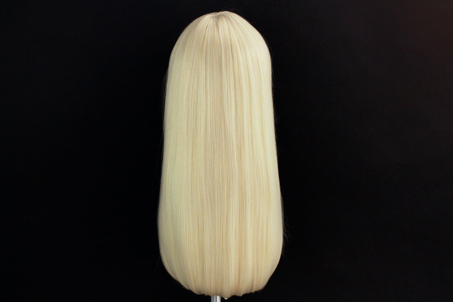 She is a non lacefront wig with a blunt cut fringe and a skin top parting at the crown for a more realistic looking part.