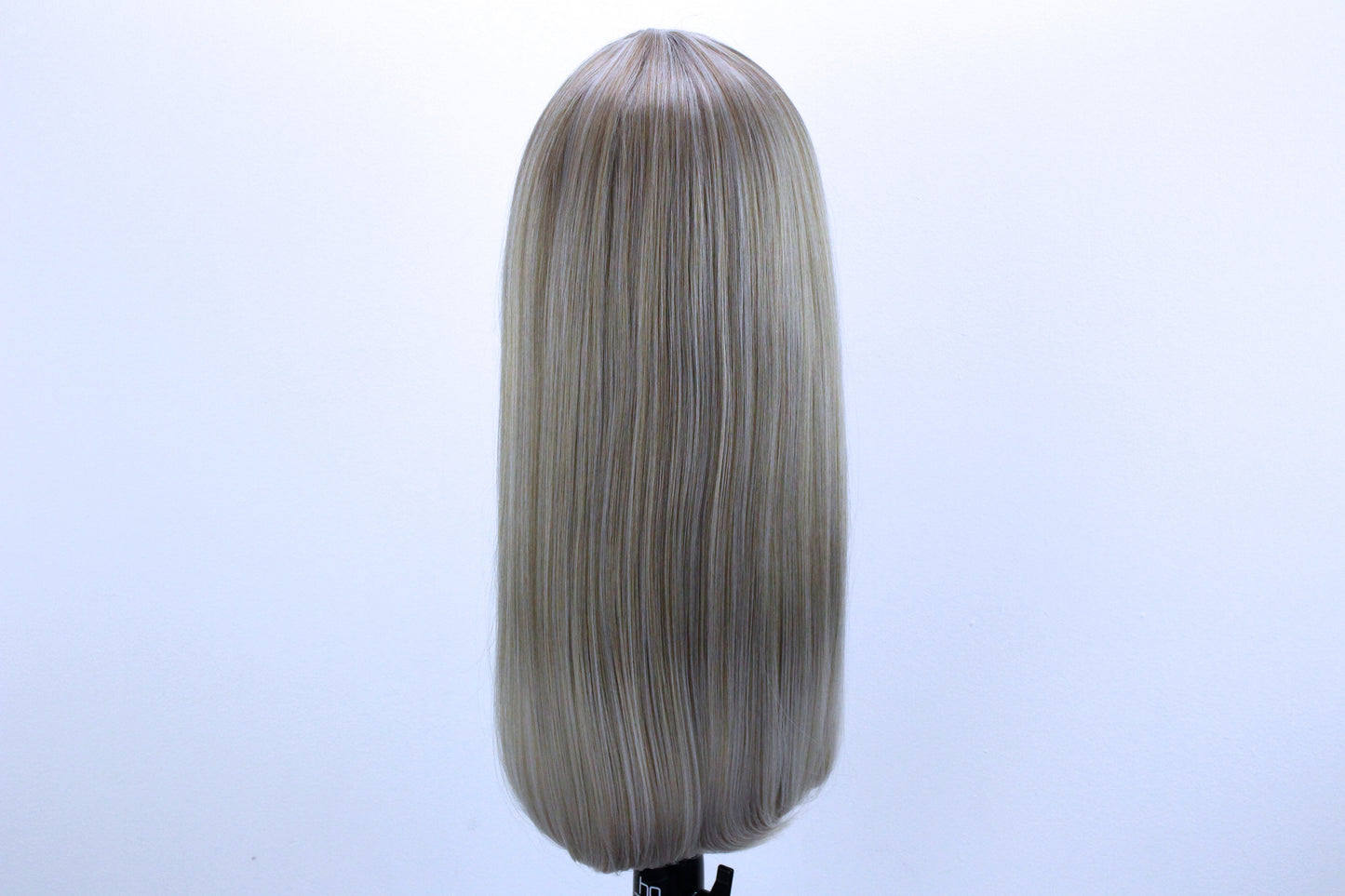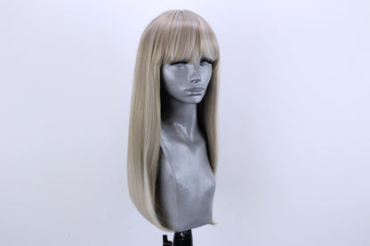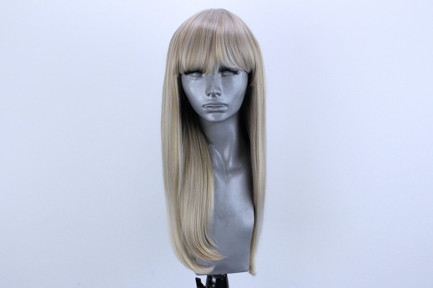 She is a non lacefront wig with a blunt cut fringe and a skin top parting at the crown for a more realistic looking part.